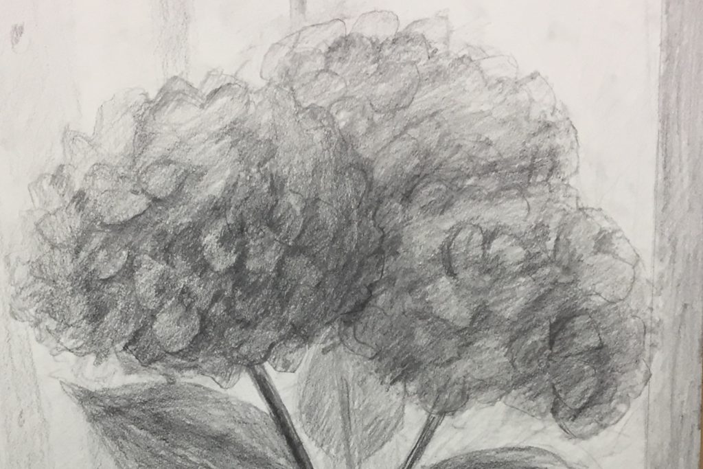 アジサイは丸い塊としてとらえて描くこと。花びらは全部描くのではなく、際立ってみえる部分を押さえて描けばそれっぽく見える。