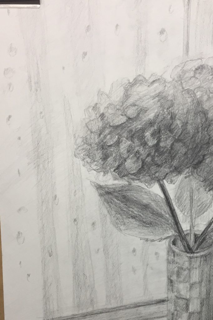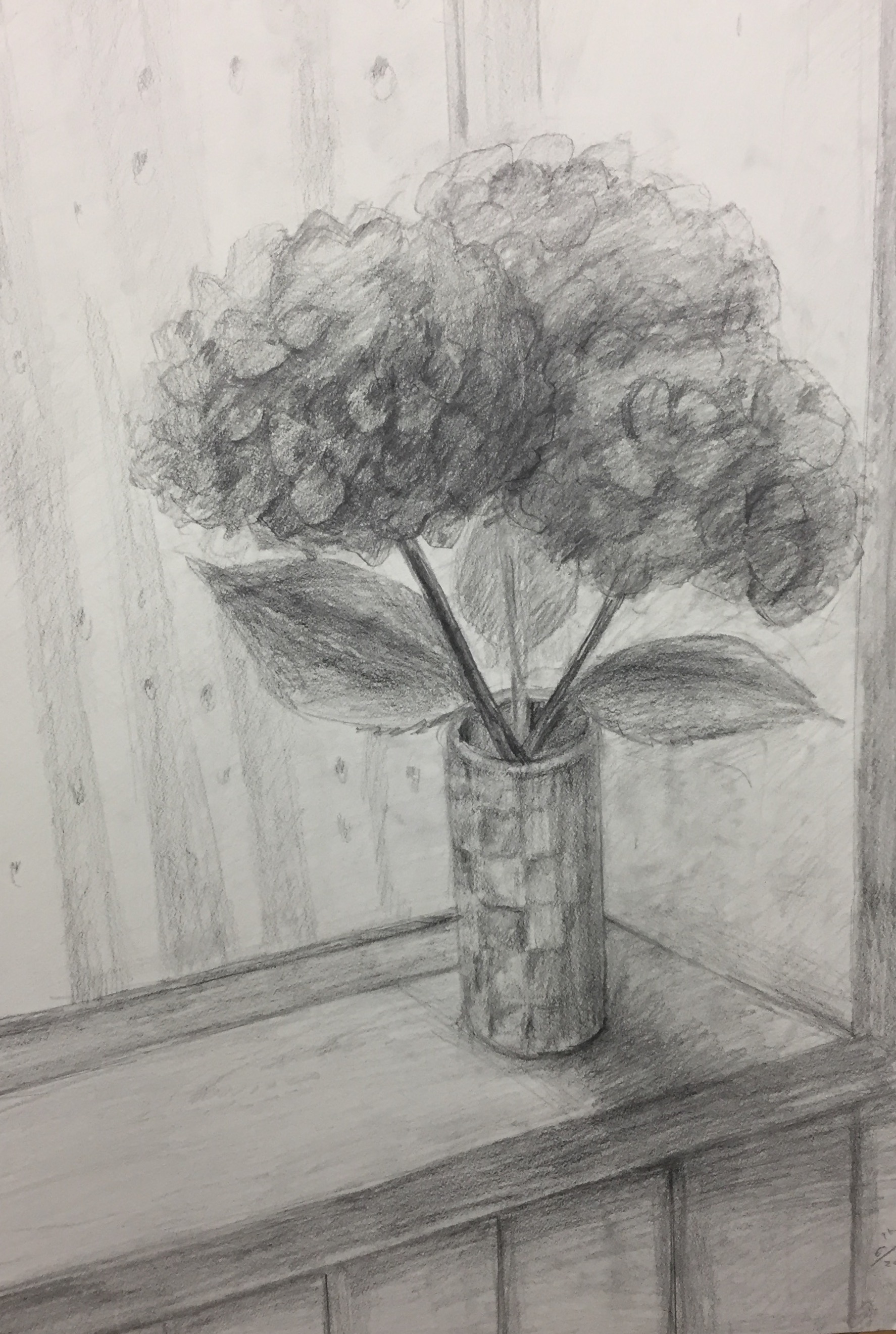 今回はじめての想定デッサンと言うことで、このやり方でいいのかな?と戸惑いながらでした。でもって描きたい要素が多く、「アジサイの数減らしたら?」なんて先生にアドバイスを頂いたんですが、どうしても画面を華やかにしたかったので減らしませんでした。